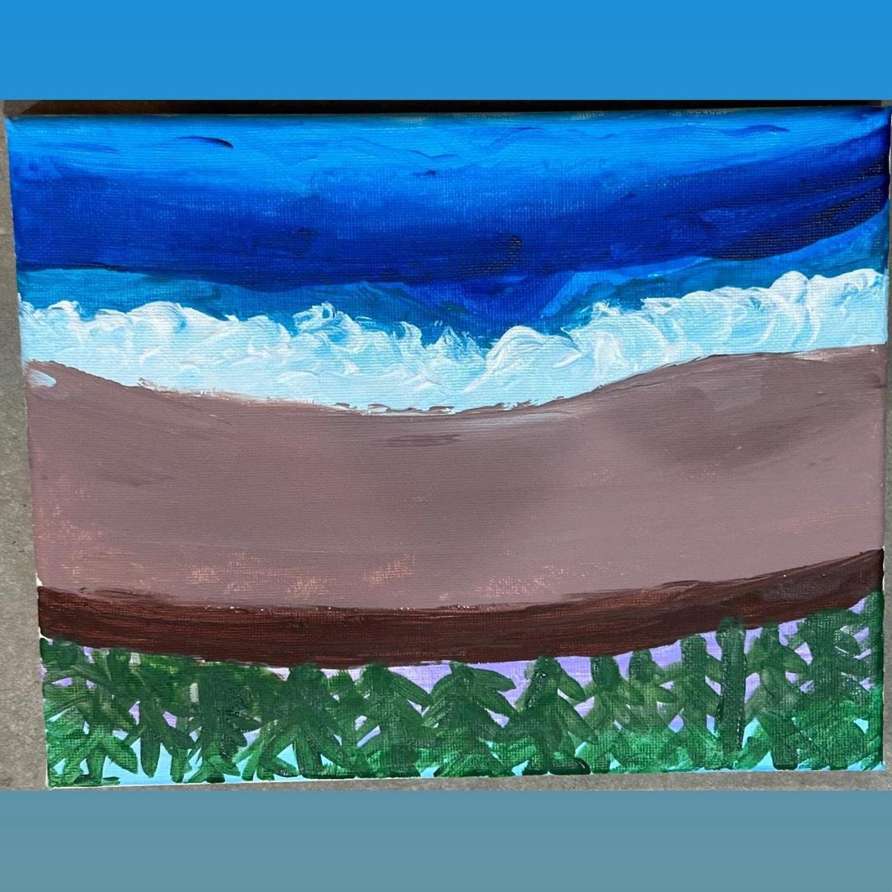 Beach Joy captures the quiet happiness found where land meets water. Broad horizontal layers of color evoke the rhythm of the shoreline—deep blues suggesting the vast, calming sea, soft whites echoing gentle waves, and warm earthy tones grounding the scene like sunlit sand. The lush green foreground hints at coastal life and growth, framing the composition with freshness and vitality. With its simple forms and expressive brushwork, the artwork invites the viewer to pause, breathe, and feel the understated joy of a peaceful day by the beach.