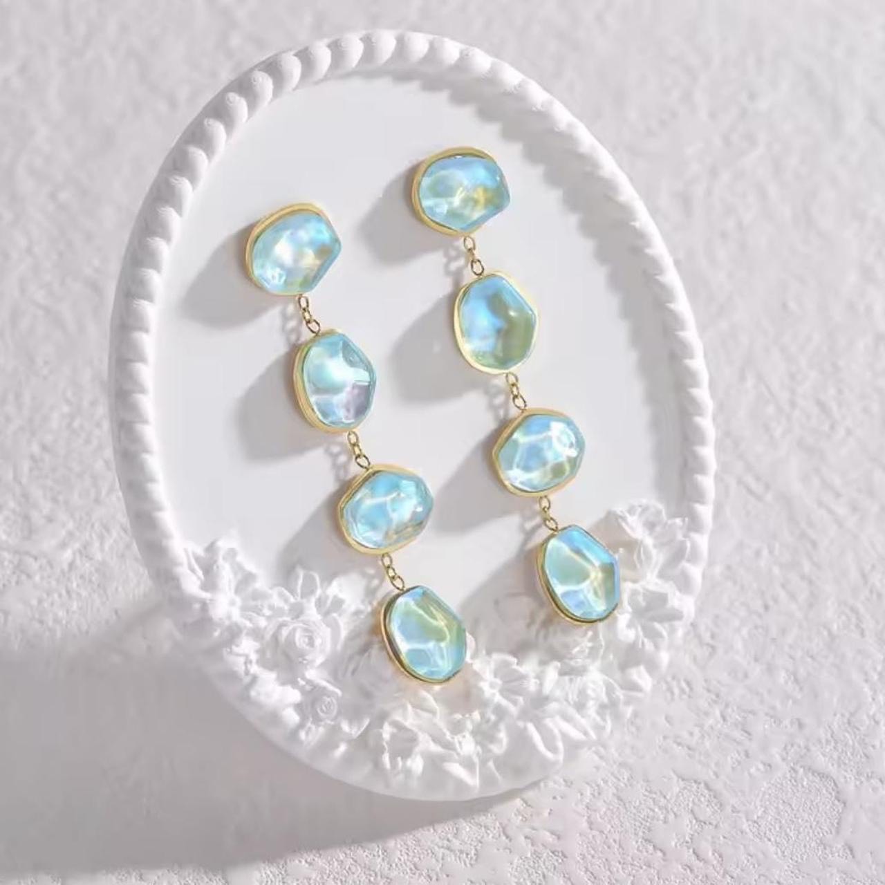 Designed to command attention without asking for it, the Celeste Cascade Drop Earrings are a study in refined movement and modern luxury. Iridescent, faceted stones catch and refract light with every turn, suspended in a graceful vertical flow that elongates the silhouette and elevates the entire look.