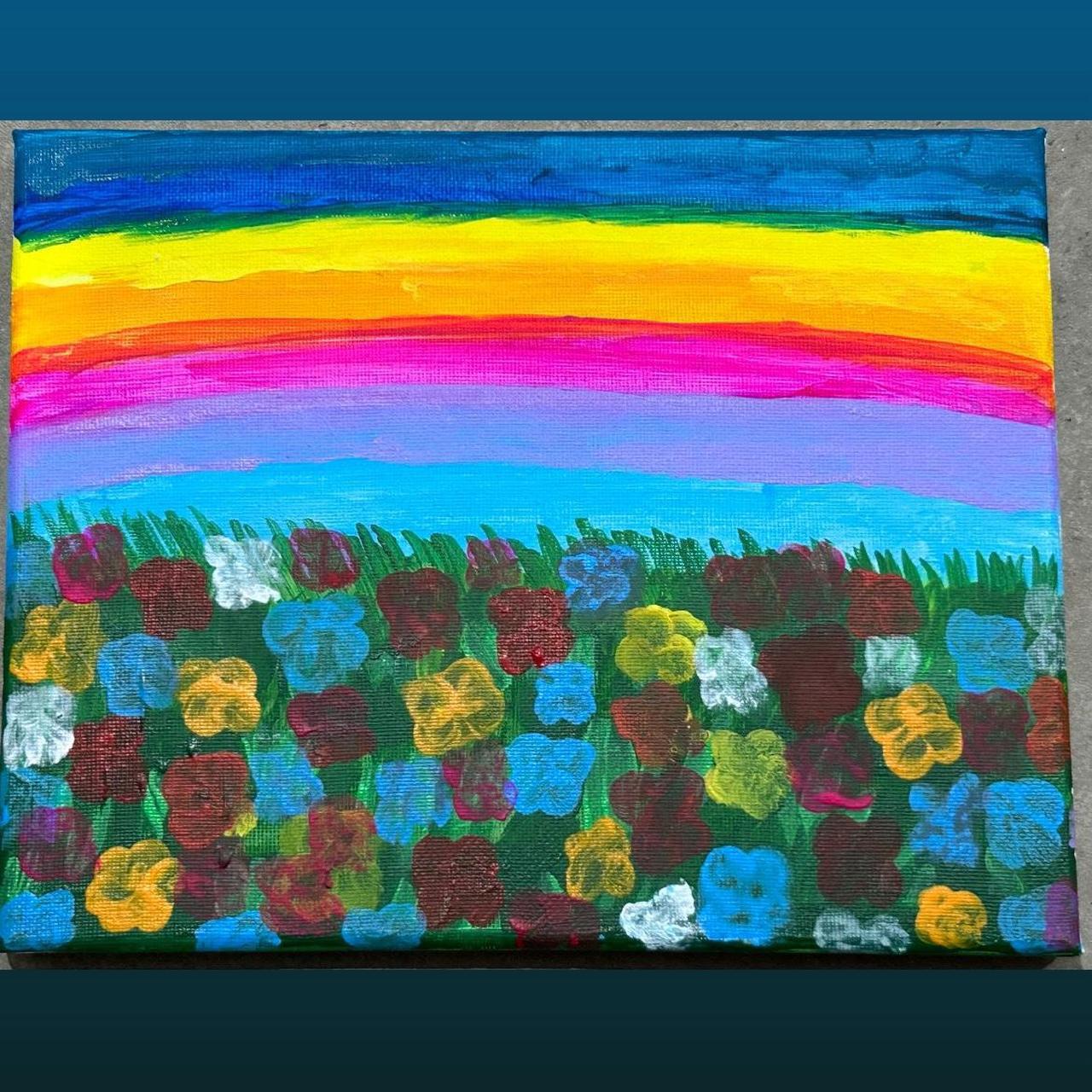 Flower Joy celebrates color, abundance, and simple happiness found in nature. A vibrant field of blossoms fills the foreground, each flower painted with bold, playful strokes that suggest movement and life. Above, layered bands of radiant color stretch across the sky like a glowing horizon, bathing the scene in warmth and optimism. The harmony between the lively flowers and the luminous sky creates a sense of openness and delight, inviting the viewer to experience joy as something shared, expansive, and ever-present.