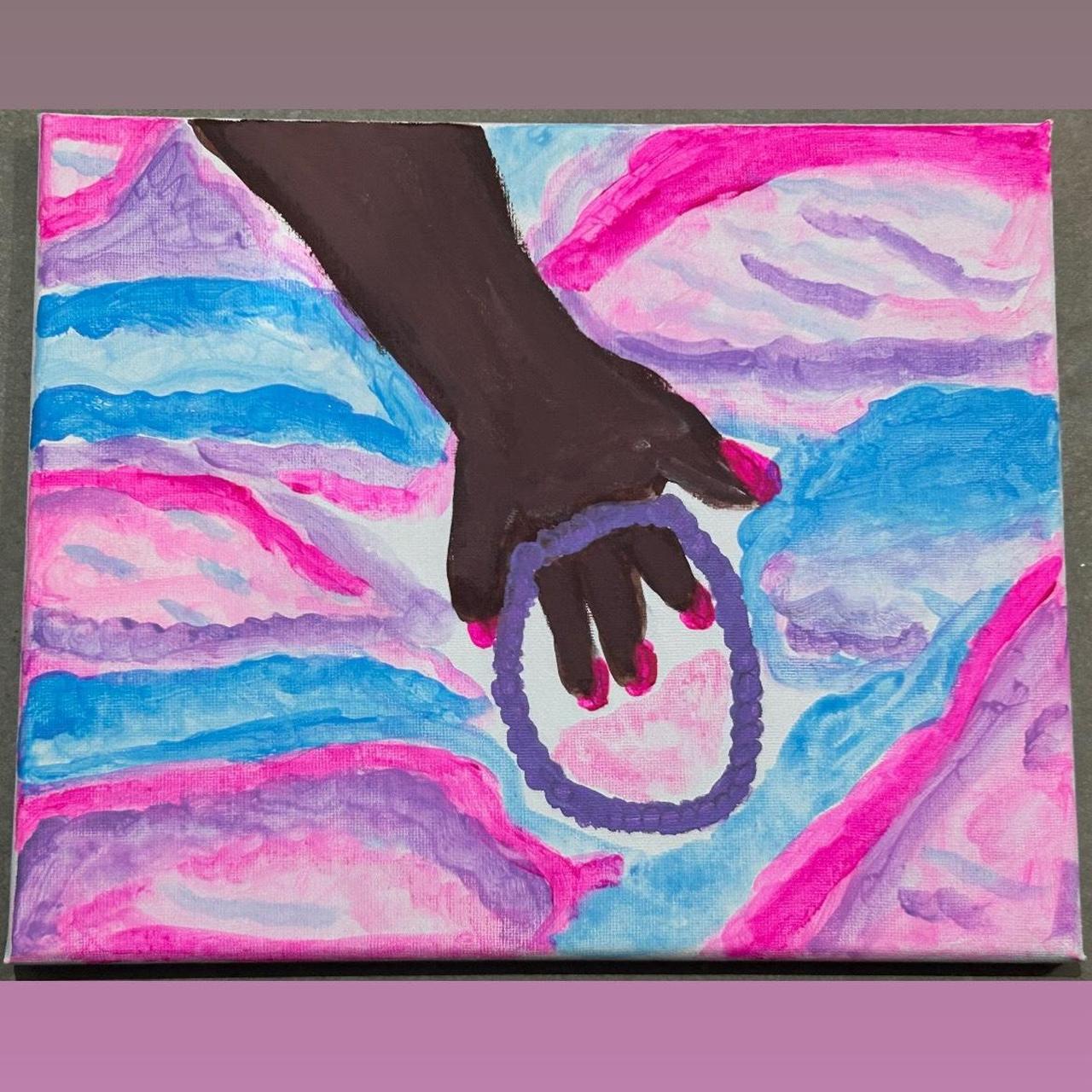 Joy’s Embrace portrays a tender moment of connection, where touch becomes a language of comfort and belonging. A dark, reaching hand holds a circular form—suggestive of a bracelet, loop, or symbolic bond—set against flowing waves of pinks, blues, and violets. These swirling colors evoke emotion in motion: joy, vulnerability, warmth, and calm intertwining at once. The contrast between the grounded solidity of the hand and the dreamlike background emphasizes the idea of being held steady within joy itself. The artwork speaks to intimacy, reassurance, and the quiet strength found in moments of emotional closeness.